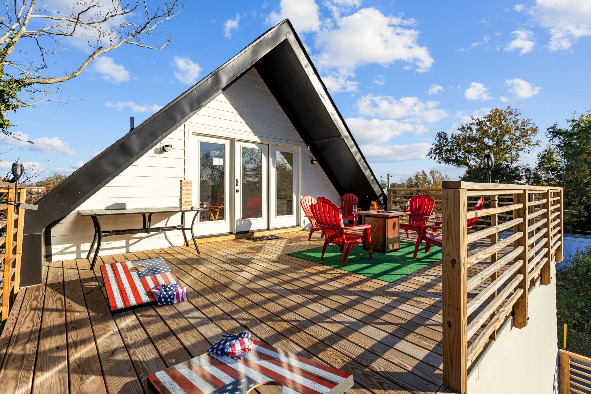 The sky deck has plenty of seating and a gas fire pit!
